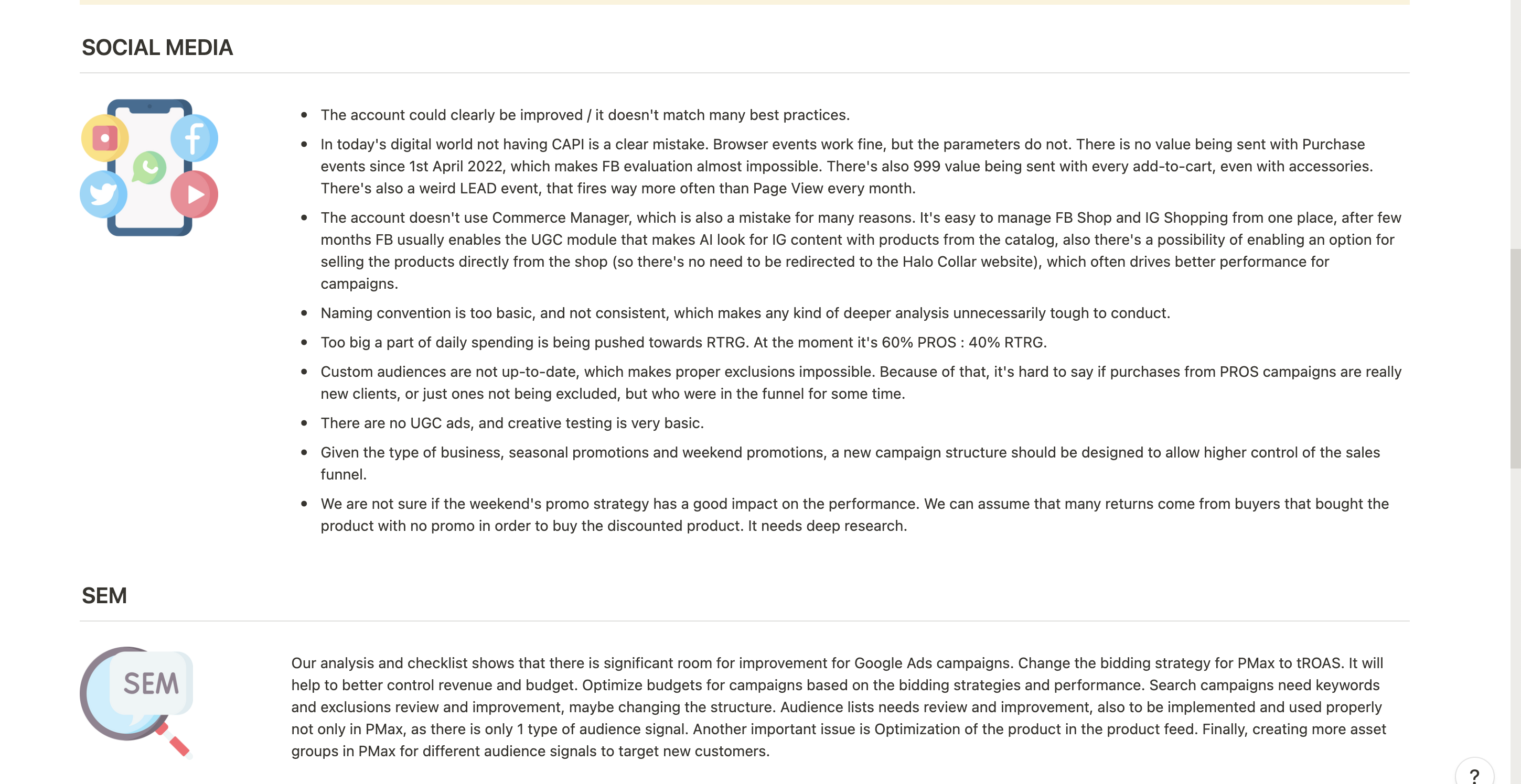 Receive a full list of recommendations to improve the performance of every single channel in your marketing funnel