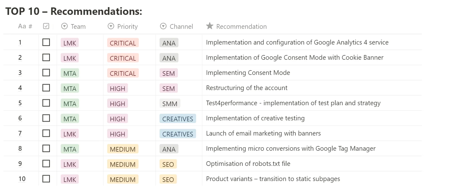 Operations Analysis – This involved analyzing individual channels and providing recommendations for their optimization.