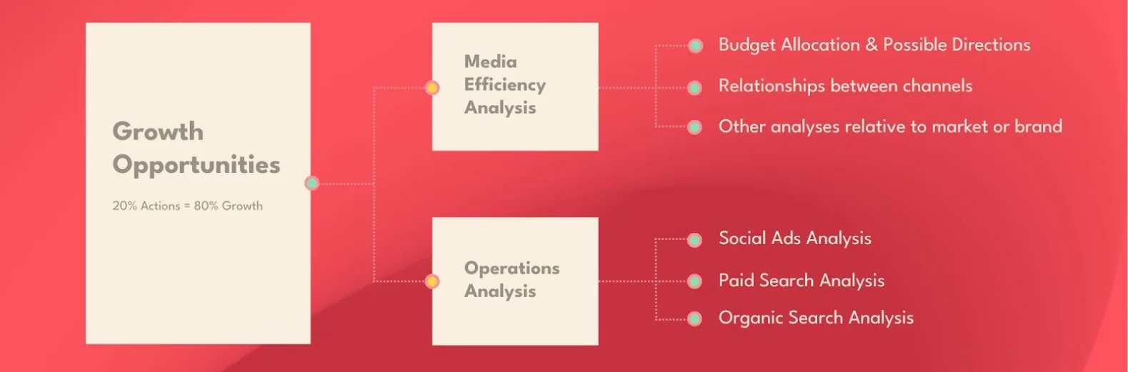 Media Efficiency Analysis – This is a strategic analysis that seeks to answer the question “Do your marketing channels work together?” It identifies areas with the highest scaling potential. It relies on data analysis from various channels to draw common conclusions for the business. The workflow can be presented as follows: