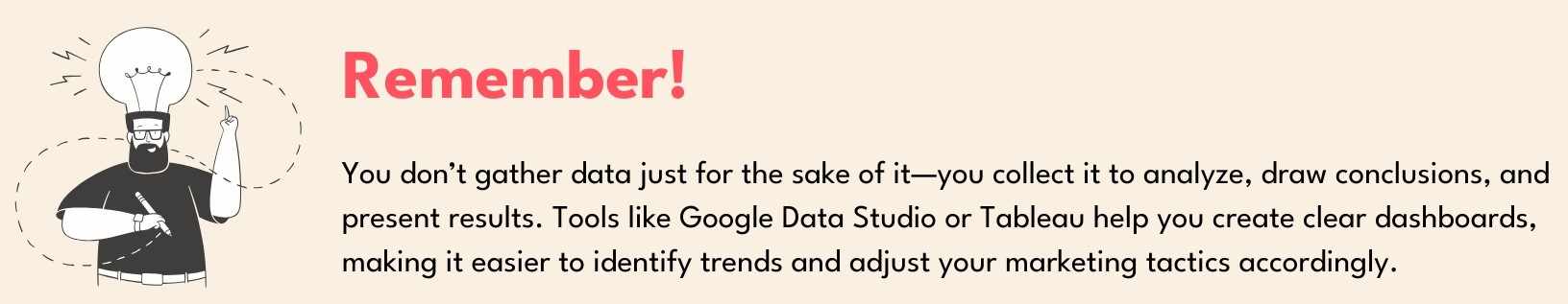 Finally, you don’t gather data just for the sake of it—you collect it to analyze, draw conclusions, and present results. Tools like Google Data Studio or Tableau help you create clear dashboards, making it easier to identify trends and adjust your marketing tactics accordingly.