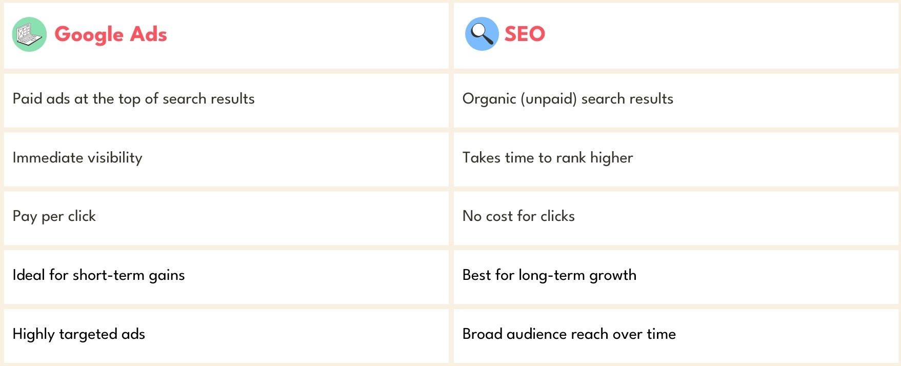 If you want to dive deeper into the differences between these platforms, check out our full SEO vs Google Ads comparison.